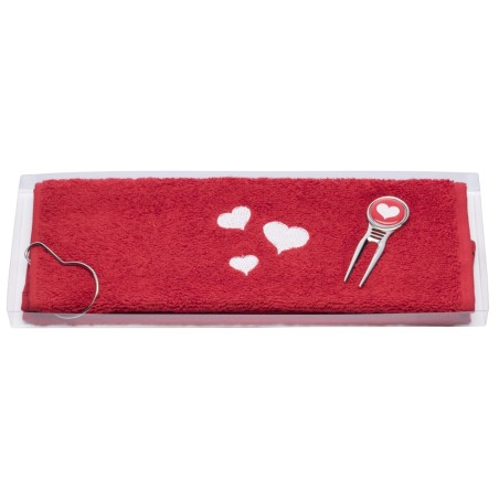 Toalla de Caddy bordada, con reparapiques, en caja transparente.